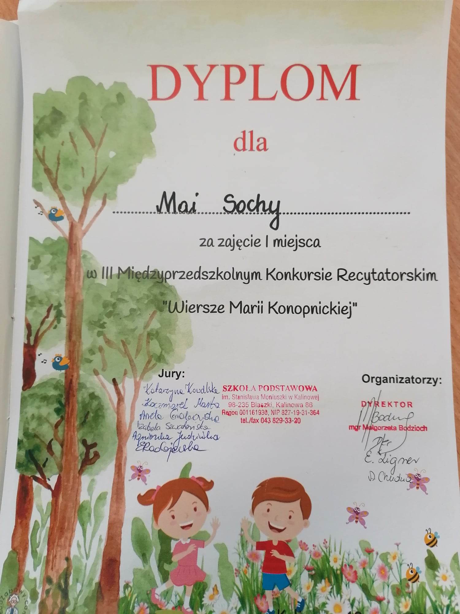 Dnia 19 maja 2023 roku w Kalinowej odbył się Międzyprzedszkolny Konkurs Recytatorski. Tym razem dzieci musiały zmierzyć się z twórczością Marii Konopnickiej, jednej z najwybitniejszych polskich pisarek i poetką literatury dziecięcej. Nasze przedszkole reprezentowało dwoje dzieci: Maja Socha z grupy „Czarodzieje” (wychowawczyni A. Grabowska) i Łukasz Molka z grupy „Misie”(wychowawczyni M. Polewska). Dzieci zaprezentowały się znakomicie. Gratulujemy im pięknego występu a Mai dodatkowo gratulujemy zajęcia I miejsca. Jesteśmy z was ogromni!